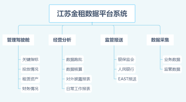 江苏金租数据平台系统现在开发完成的主要是管理驾驶舱、经营分析、监管报送、数据采集四大模块。系统业务功能架构见下图: